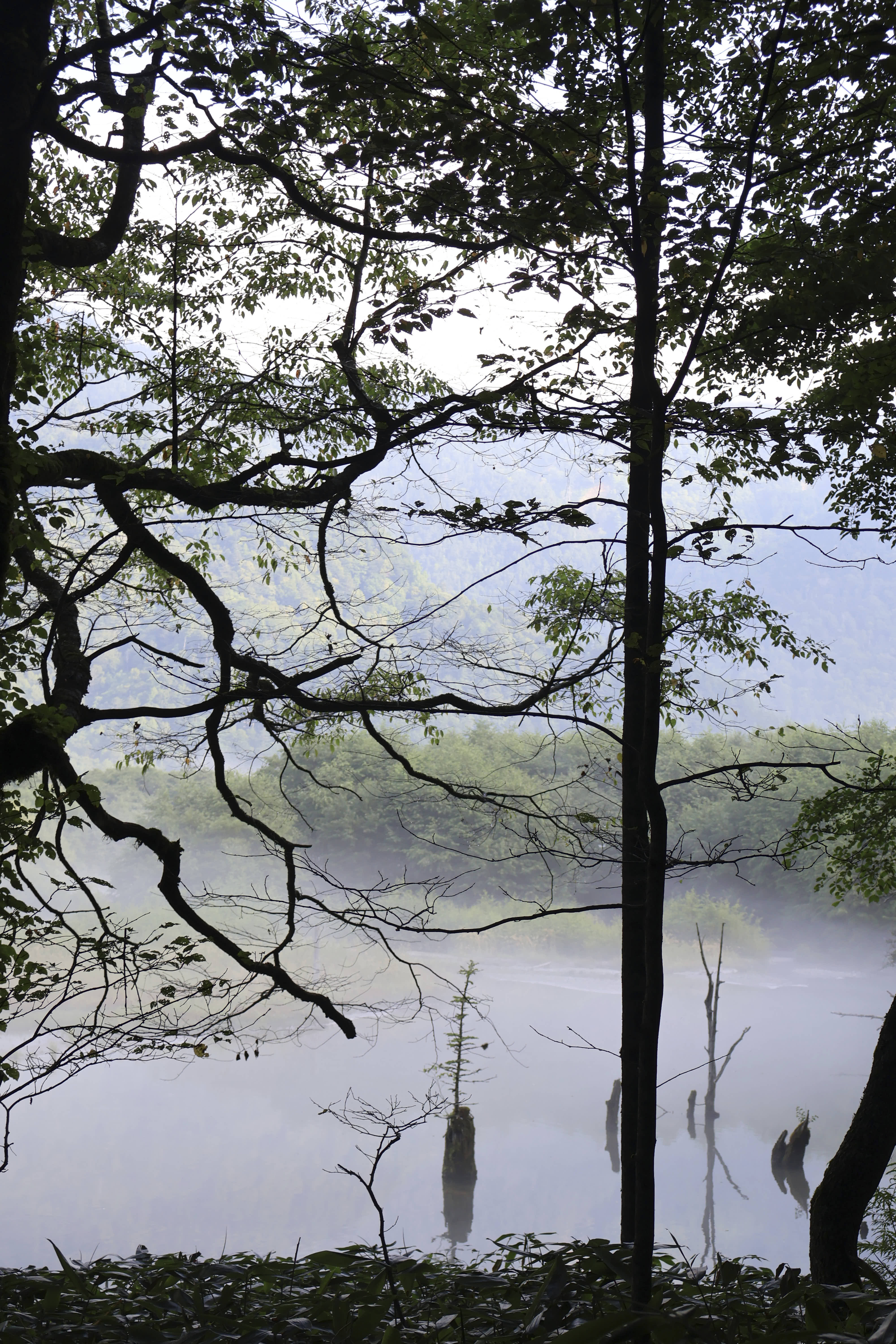 ピンと張り詰めた早朝の空気感が写真を通して伝わってきます。手前の木々をシルエットで写し撮ることで、湖畔の幻想さを際立たせています。